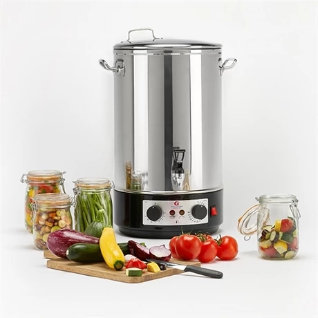 Stérilisez, cuisez, réchauffez ou encore servez des boissons chaudes grâce au bouilleur électrique 32 L pour 10 bocaux. Avec sa grande capacité de 32 L vous pourrez stériliser jusqu’à 10 bocaux simultanément. Sa cuve en acier inoxydable est adaptée au contact alimentaire, qui vous permettra de réaliser des plats en grande quantité ou des boissons chaudes. Fourni avec une colonne intérieure et 6 ressorts de maintien pour fixer les bocaux et ainsi éviter qu’ils ne bougent pendant la stérilisation.