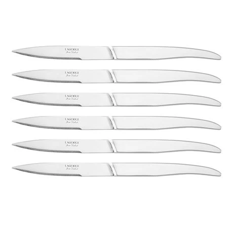 Ce Coffret de couteaux à steak Laguiole Styl’Up contient 6 couteaux à viande tout en inox ornés de l’abeille stylisée Laguiole. Monobloc, chaque couteau peut se poser à plat ou sur son champ et est doté d’une lame micro-dentée à la finition polie miroir.