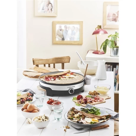 Le crépière Maxi Crêpes de Lagrange permet de réaliser des crêpes de 35 centimètres de diamètre. Elle est dotée d’une plaque de cuisson amovible en aluminium avec revêtement anti-adhésif, d’un thermostat réglable sur 5 positions pour ajuster la température de la plaque ou simplement la maintenir chaude, et d’un voyant de contrôle. Ses larges poignées en bois assurent une manipulation en toute sécurité, et son support amovible pour spatules permet de garder tous vos ustensiles à portée de main. La crépière Maxi Crêpes est vendu avec une grande spatule, une grande louche, un répartiteur en bois et un rince répartiteur.