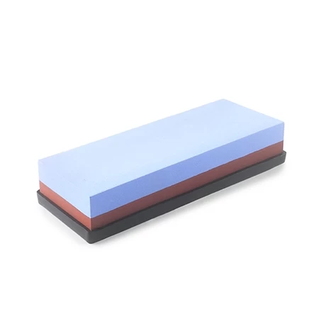 La pierre à aiguiser double face Ibili est vendue avec un socle en caoutchouc noir.