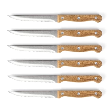 Ne soyez plus en difficulté pour découper vos morceaux de viandes avec ce bloc de 6 couteaux à steak. Sa lame crantée en acier inoxydable vous permettra de venir à bout de chaque morceau de viande. Solide le manche en bois d’acacia est riveté. Son bloc de rangement vous permet de déposer vos couteaux directement sur le plan de travail, afin de toujours les avoir à portée de main.