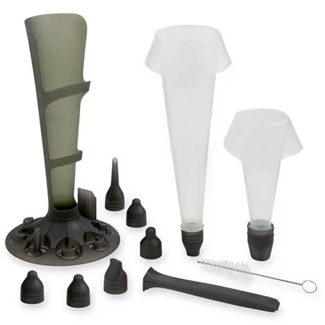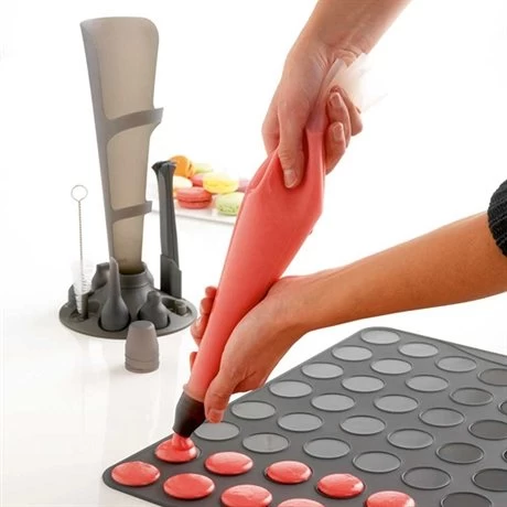 Grâce au set poche à douille de Mastrad, tout est à portée de main pour garnir et décorer très facilement les cupcakes, les biscuits, les choux… Placée en position verticale sur le support, la poche se remplit rapidement et sans salissure. Il est même possible de la refermer en cours de travail et de la reposer sur le support.