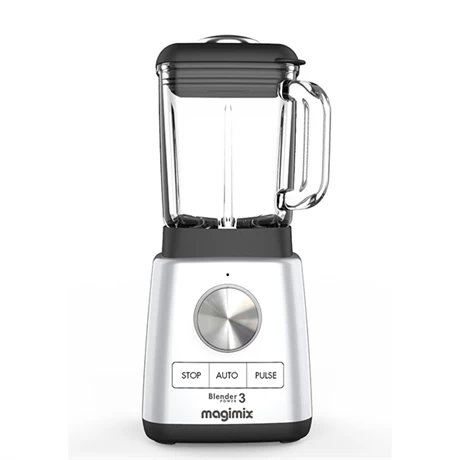 Magimix est une enseigne reconnue pour la qualité de ses appareils, et notamment au niveau des moteurs. Avec 1000 W de puissance, le blender Power 3 Magimix peut atteindre jusqu’à 22 000 tours/min et il entraîne des lames en acier inoxydable qui vous offriront une très grande force de mixage, optimale pour tout aliment même congelé. Et pour que cette puissance ne dégrade pas le bol gradué au fur et à mesure des utilisations, il est fabriqué en verre borosilicate, matériau ultra résistant, anti-rayures et antichocs. Equipé d’une spatule, d’un bouchon doseur et de trois boutons à pression, vous n’aurez qu’à presser « Pulse » pour délivrer instantanément toute la puissance du Blender Power puis « Stop » pour vérifier le résultat. Le dernier bouton, « Auto », est couplé au bouton rotatif sélecteur qui choisira soit la vitesse manuellement, soit une de ses 4 fonctions préprogrammées.