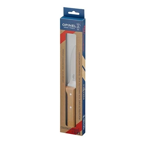 Ce Couteau viande et volaille N°122 lame inox 13 cm de Opinel est idéal pour dénerver et désosser les viandes et les volailles. Sa lame de 13 cm en acier inoxydable est réputée pour son tranchant et sa résistance à la corrosion. D’une épaisseur de 2,5 mm, elle restera rigide et stable lors de la découpe. En hêtre issu d’exploitations françaises, le manche est dur et résistant. Recouvert d’une couche de vernis, il est protégé contre l’humidité et les salissures. Sa garde permet de travailler en sécurité.