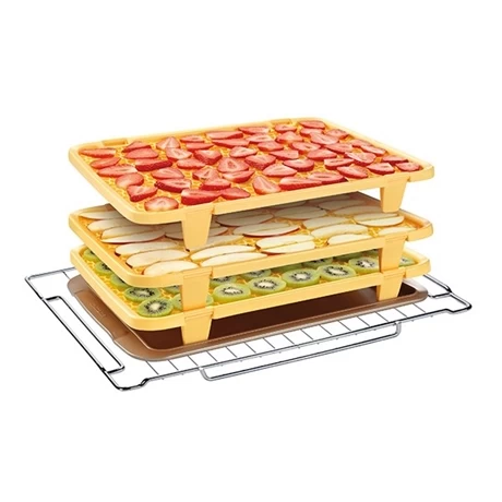 La planche de séchage 3 niveaux est idéale pour faire sécher au four vos fruits, légumes, champignons, viandes, pâtes maison… et ainsi profiter de leurs valeurs nutritives au maximum ! Économiques et ergonomiques, les planches se superposent pour une économie d’énergie pendant le séchage et s’emboîtent les unes dans les autres pour un gain de place au rangement.