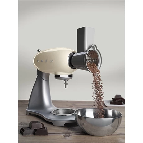 L’accessoire tranchoir et râpe à cylindres SMSG01 Smeg se place à l’avant de votre robot, pour l’utiliser, retirez les accessoires de pâtisserie ainsi que la cuve que vous pouvez placer à la réception lorsque les aliments tombent râpés ou tranchés.